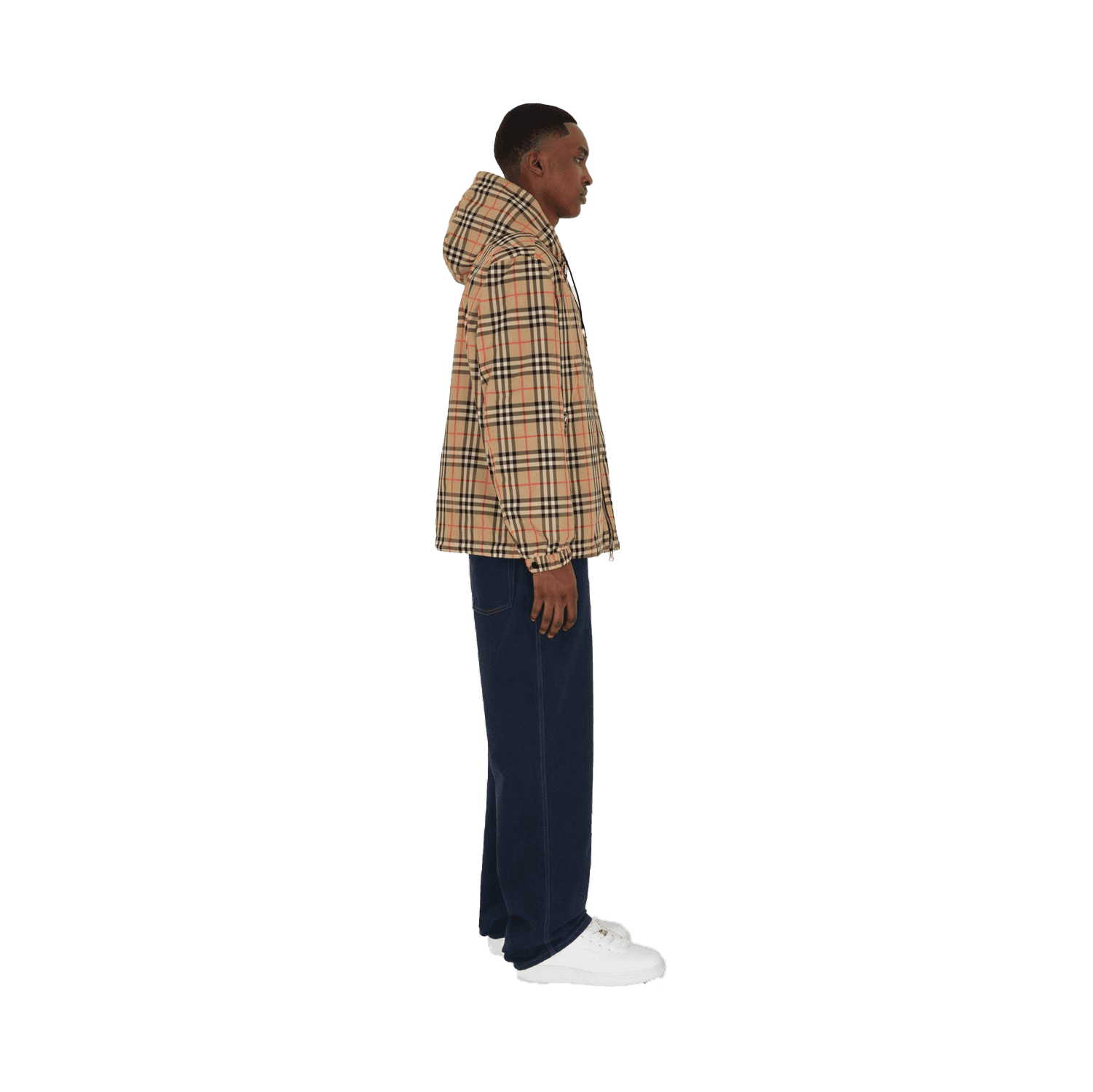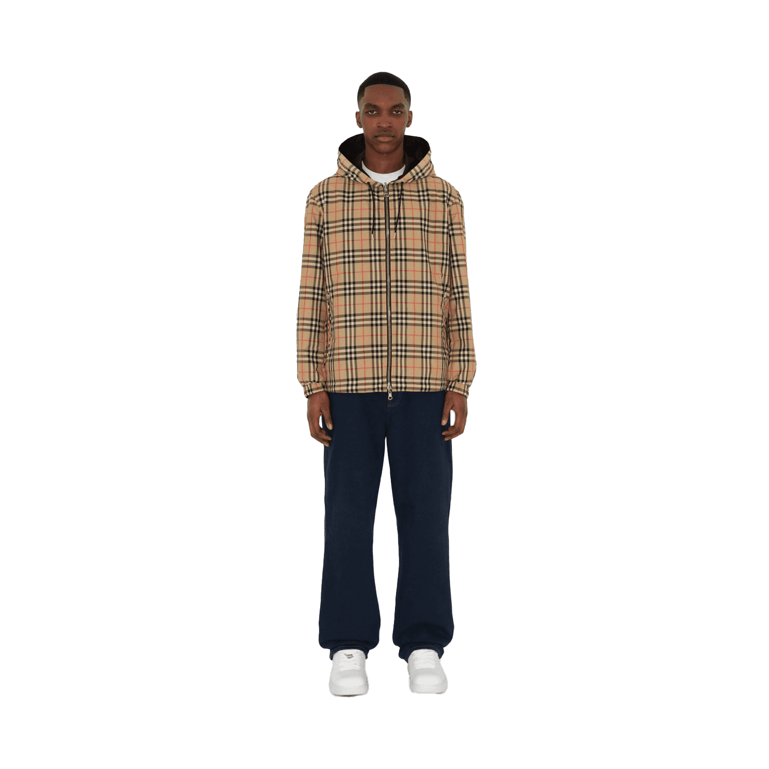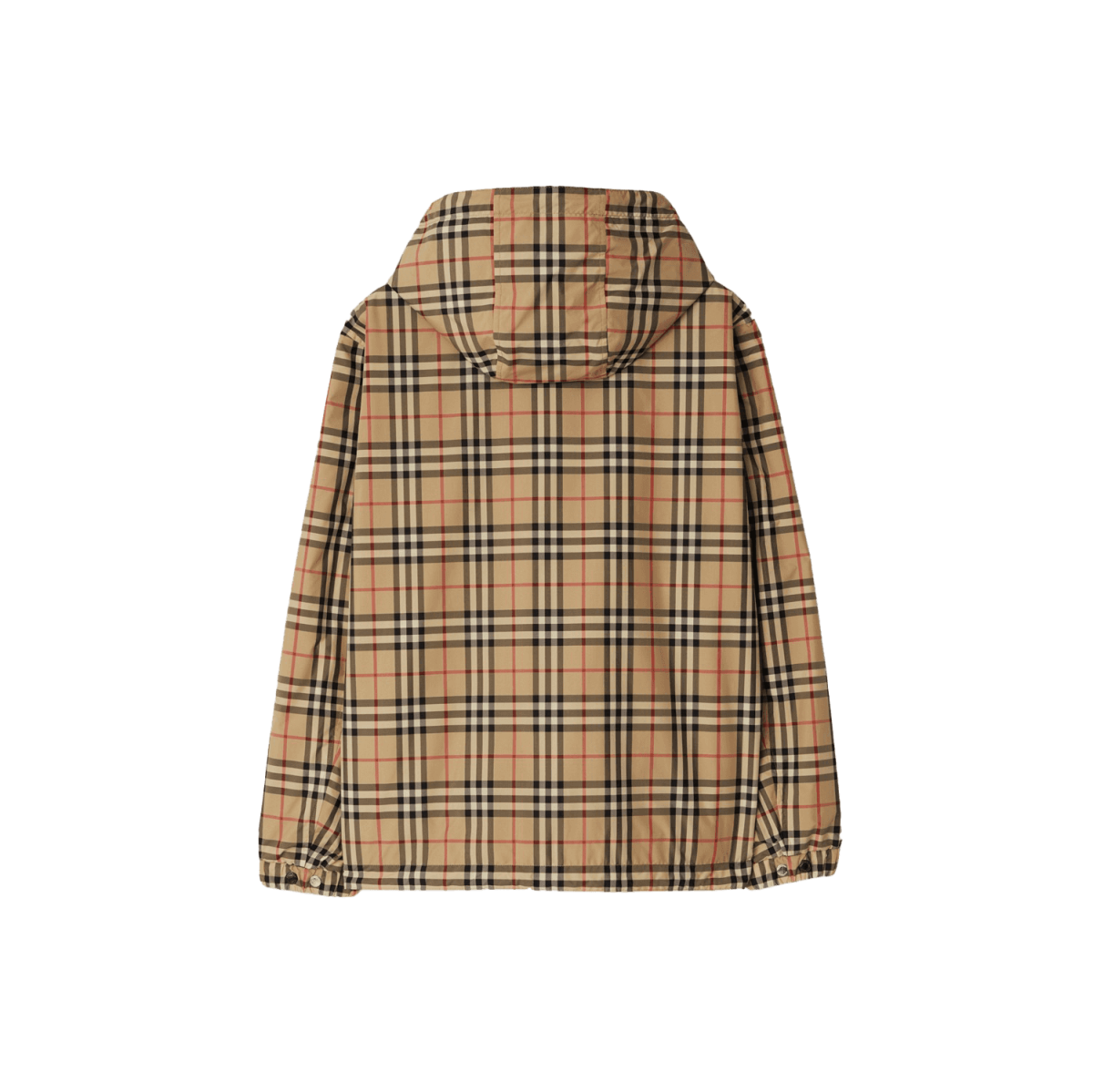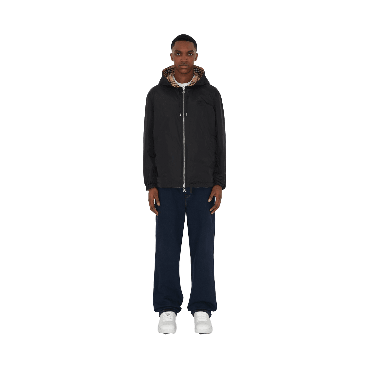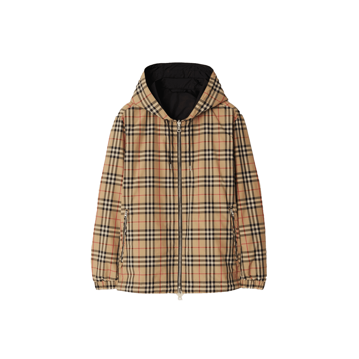 - A lightweight jacket reversing from the Burberry Check to a solid colour with a logo appliqué. The hooded style is cut to a relaxed fit.