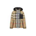- A hooded puffer jacket in nylon, filled with duck down and feathers. The reversible design switches from Burberry Check to a solid colour with an appliquéd logo. The funnel-neck style is cut to a regular fit.