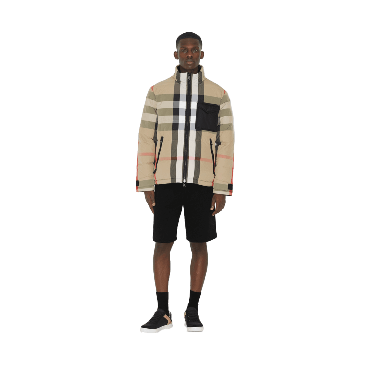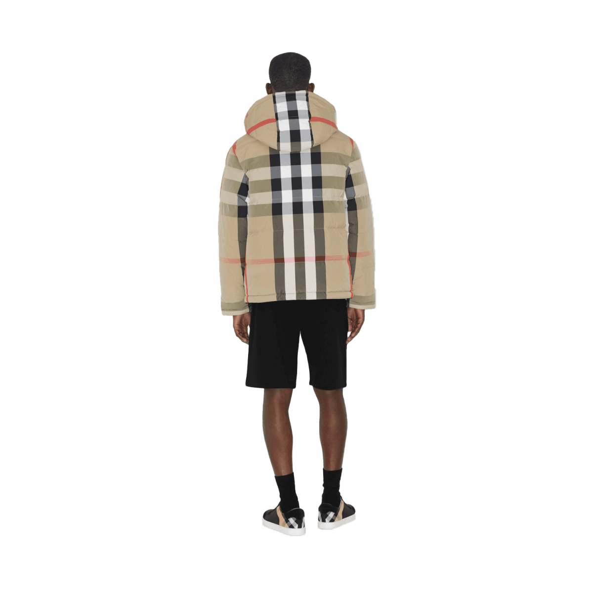 - A hooded puffer jacket in nylon, filled with duck down and feathers. The reversible design switches from Burberry Check to a solid colour with an appliquéd logo. The funnel-neck style is cut to a regular fit.