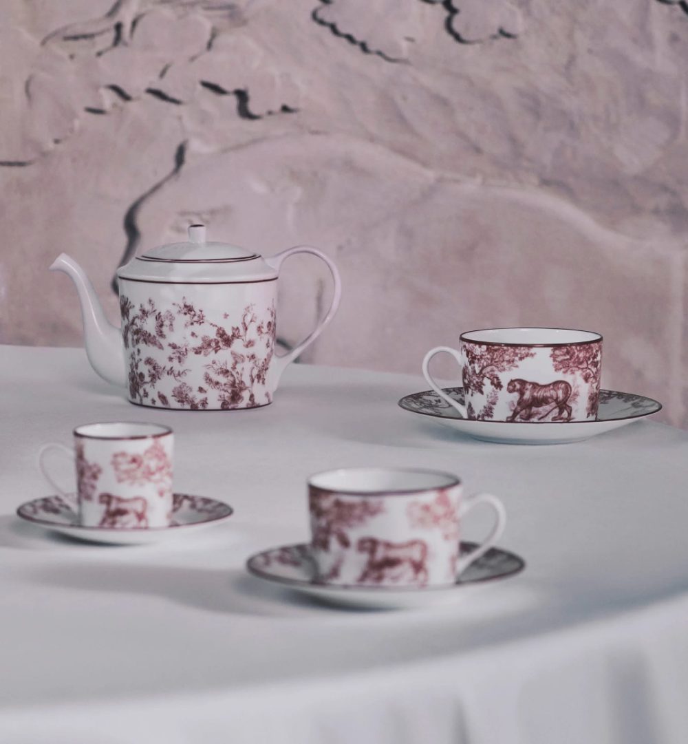 A symbol of Dior’s savoir-faire and excellence, Toile de Jouy is constantly reimagined by Maria Grazia Chiuri and adorns new creations in Limoges porcelain. Plates, coffee ware and other stylized pieces are embellished with the burgundy motif. Intense and bewitching, the color also enhances a placemat and napkin set, embroidered pillow, small candle and trinket tray. A celebration of the art of hosting dear to Mr. Dior.