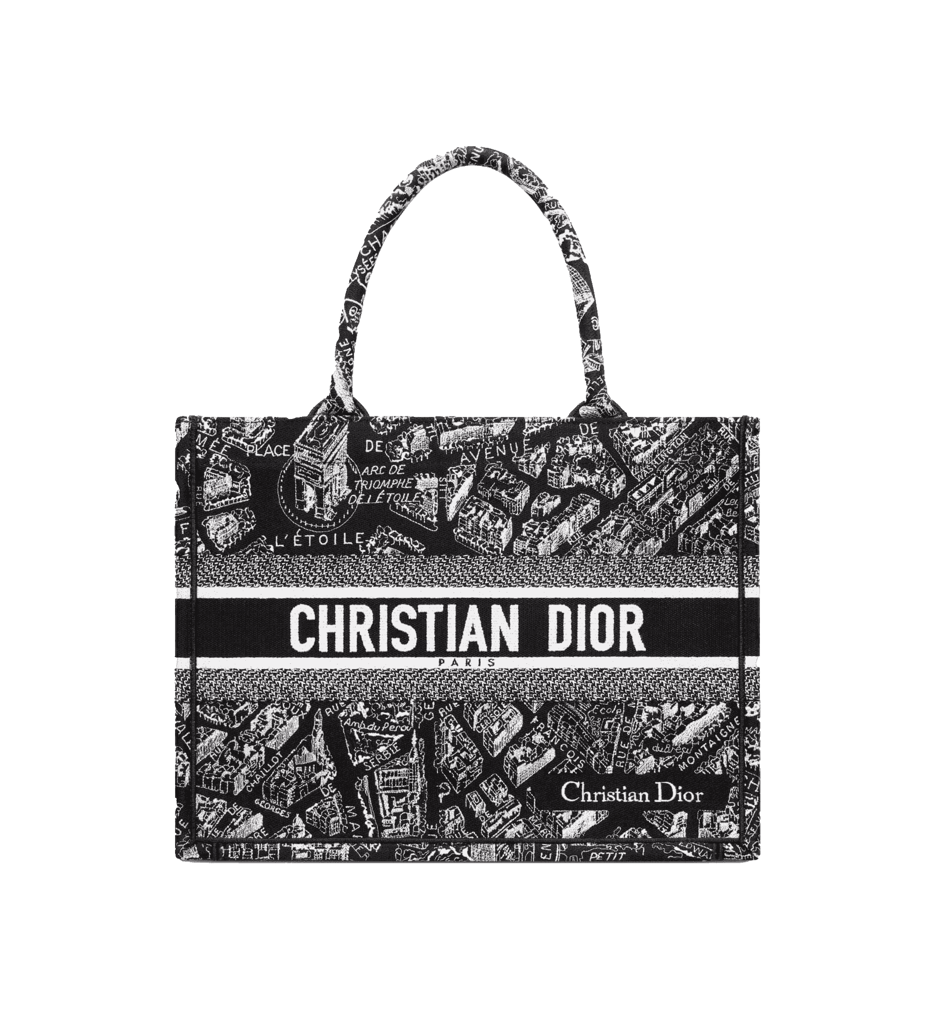 Introduced by Maria Grazia Chiuri, Creative Director of Christian Dior, the Dior Book Tote has become a staple of the Dior aesthetic. Designed to hold all the daily essentials, the style is fully embroidered with the season’s signature black and white Plan de Paris motif, inspired by the House archives and centered around Dior’s historic address on Avenue Montaigne. Adorned with the Christian Dior Paris signature on the front, the medium tote exemplifies the House’s signature savoir-faire and may be carried by hand or worn over the shoulder.