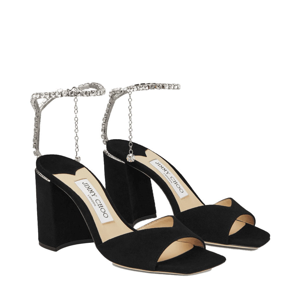 Blurring the line between footwear and jewellery, the iconic Saeda sandal in plush suede is instantly recognisable thanks to a crystal-embellished anklet. This shining statement is adorned with crystals which includes a drop crystal that hangs elegantly at the back of the shoe. The anklet is designed to sit low, effortlessly elongating the leg. A striking and glamorous shoe, this pair is set on an 85mm block tango heel.